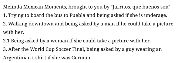 3. After the World Cup Soccer Final, being asked by a guy wearing an Argentinian t-shirt if she was German.